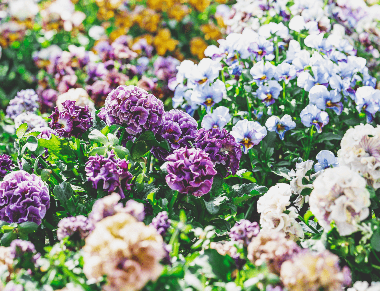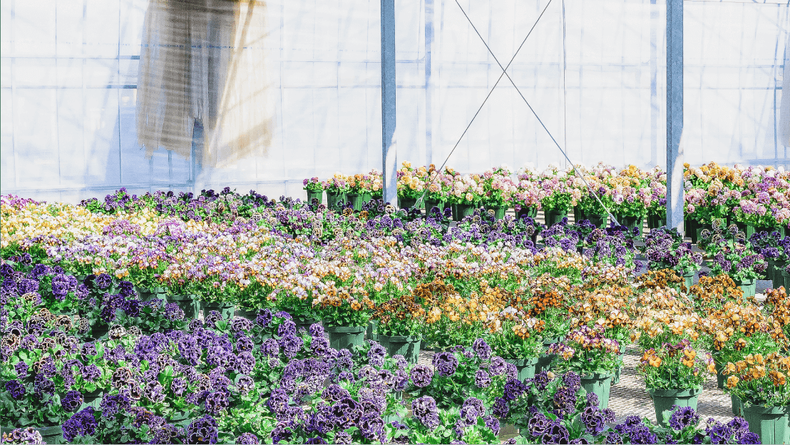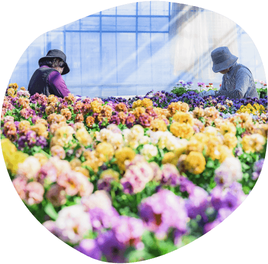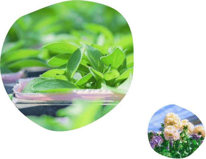 高品質な苗づくりをモットーに、秋はパンジー、ビオラ、春はペチュニア、ニチニチソウ、カリブラコア、マーガレットなど、少量多品目の花苗を1300坪のハウスで生産しています。