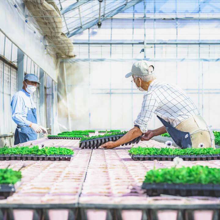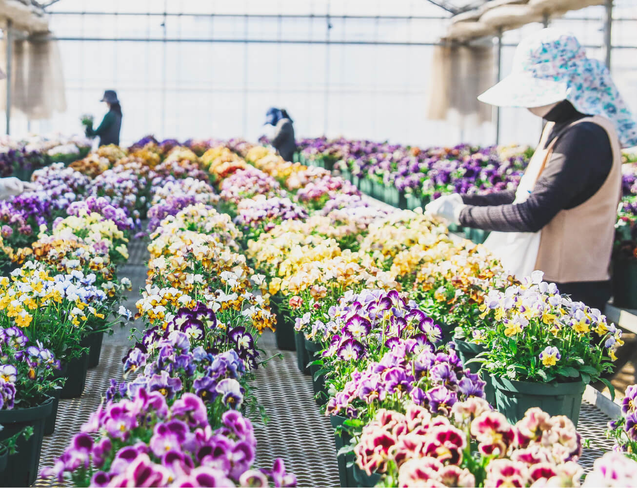 「高品質な花苗づくり」をモットーに、秋はパンジー、ビオラ、春はペチュニア、ニチニチソウ、カリブラコア、マーガレットなど、年間約50品目の花苗を生産しています。多品目を生産し、園芸店やお客さまからのご意見を商品づくりに反映し、オリジナル品種の開発にも力を注いでいます。
